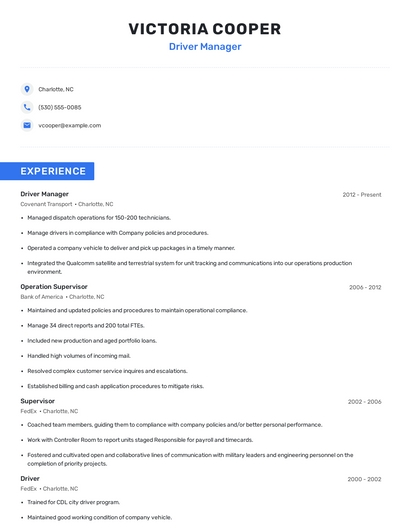 Build a professional driver manager resume in minutes. Browse through our resume examples to identify the best way to word your resume. Then choose from 5+ resume templates to create your driver manager resume.