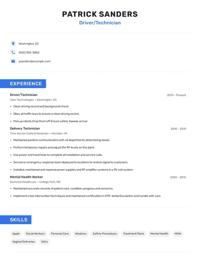 Build a professional driver/technician resume in minutes. Browse through our resume examples to identify the best way to word your resume. Then choose from 5+ resume templates to create your driver/technician resume.