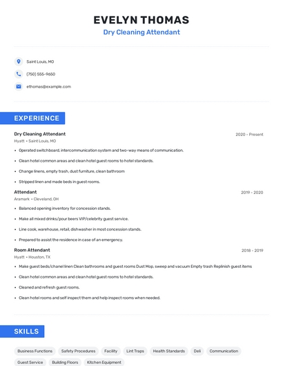 Build a professional dry cleaning attendant resume in minutes. Browse through our resume examples to identify the best way to word your resume. Then choose from 5+ resume templates to create your dry cleaning attendant resume.