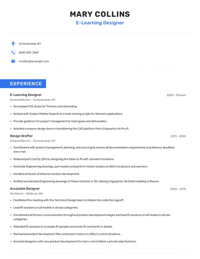 Build a professional e-learning designer resume in minutes. Browse through our resume examples to identify the best way to word your resume. Then choose from 5+ resume templates to create your e-learning designer resume.
