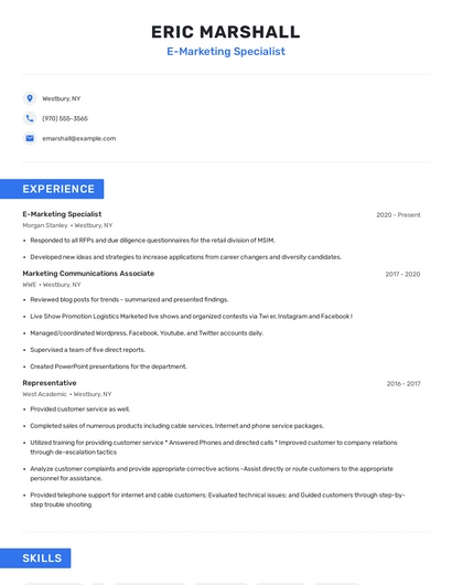 Build a professional e-marketing specialist resume in minutes. Browse through our resume examples to identify the best way to word your resume. Then choose from 5+ resume templates to create your e-marketing specialist resume.