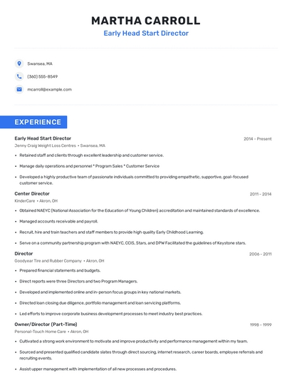 Build a professional early head start director resume in minutes. Browse through our resume examples to identify the best way to word your resume. Then choose from 5+ resume templates to create your early head start director resume.