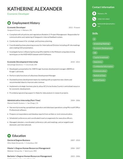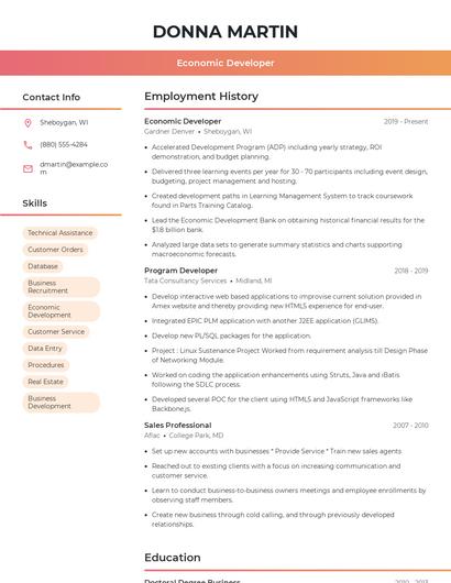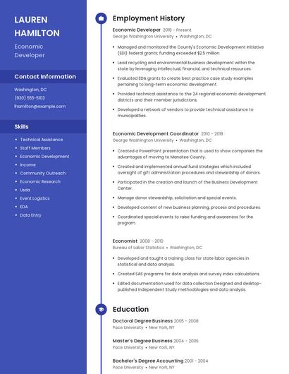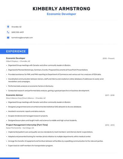 You can use Zippia's AI resume builder to make the resume writing process easier while also making sure that you include key information that hiring managers expect to see on an economic developer resume. You'll find resume tips and examples of skills, responsibilities, and summaries, all provided by Zippi, your career sidekick.