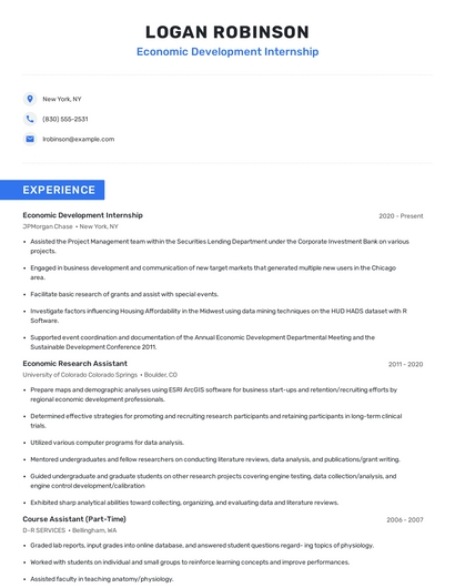 Build a professional economic development internship resume in minutes. Browse through our resume examples to identify the best way to word your resume. Then choose from 5+ resume templates to create your economic development internship resume.