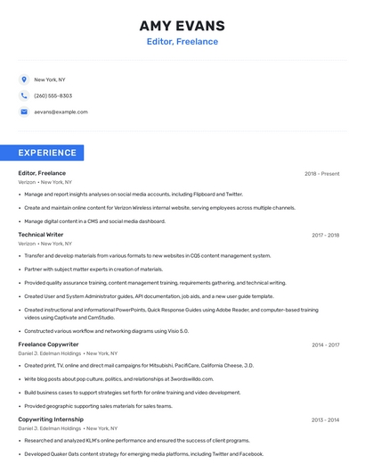Build a professional editor, freelance resume in minutes. Browse through our resume examples to identify the best way to word your resume. Then choose from 5+ resume templates to create your editor, freelance resume.