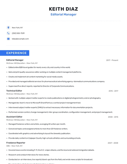 Build a professional editorial manager resume in minutes. Browse through our resume examples to identify the best way to word your resume. Then choose from 5+ resume templates to create your editorial manager resume.