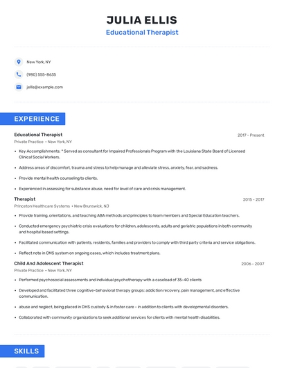 Build a professional educational therapist resume in minutes. Browse through our resume examples to identify the best way to word your resume. Then choose from 5+ resume templates to create your educational therapist resume.