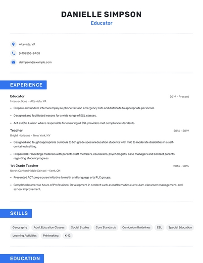 Build a professional educator resume in minutes. Browse through our resume examples to identify the best way to word your resume. Then choose from 5+ resume templates to create your educator resume.