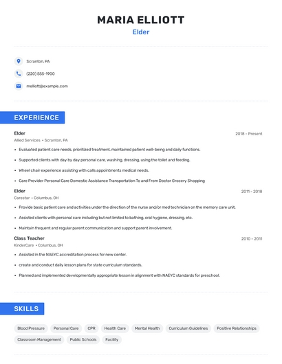 Build a professional elder resume in minutes. Browse through our resume examples to identify the best way to word your resume. Then choose from 5+ resume templates to create your elder resume.