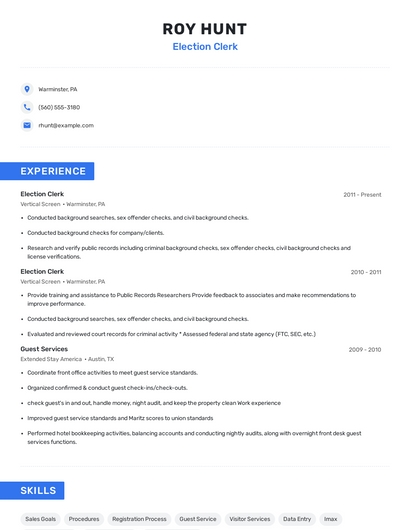 Build a professional election clerk resume in minutes. Browse through our resume examples to identify the best way to word your resume. Then choose from 5+ resume templates to create your election clerk resume.