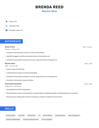 The most important skills for an electric wirer resume and required skills for an electric wirer to have include: