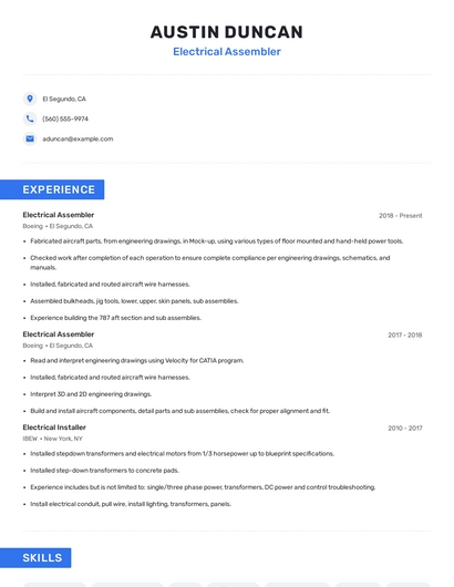 Build a professional electrical assembler resume in minutes. Browse through our resume examples to identify the best way to word your resume. Then choose from 5+ resume templates to create your electrical assembler resume.