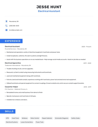 Build a professional electrical assistant resume in minutes. Browse through our resume examples to identify the best way to word your resume. Then choose from 5+ resume templates to create your electrical assistant resume.
