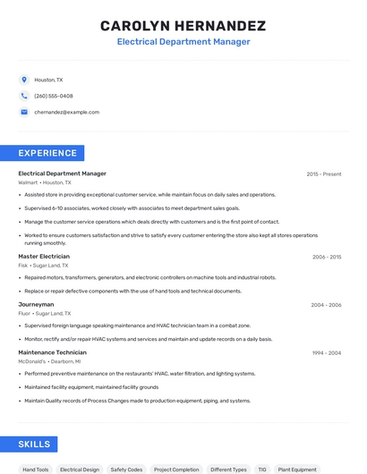 Build a professional electrical department manager resume in minutes. Browse through our resume examples to identify the best way to word your resume. Then choose from 5+ resume templates to create your electrical department manager resume.