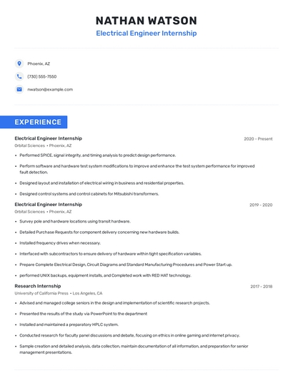 Build a professional electrical engineer internship resume in minutes. Browse through our resume examples to identify the best way to word your resume. Then choose from 5+ resume templates to create your electrical engineer internship resume.
