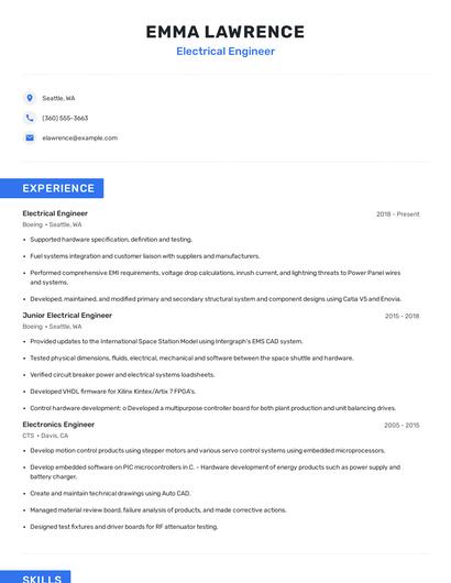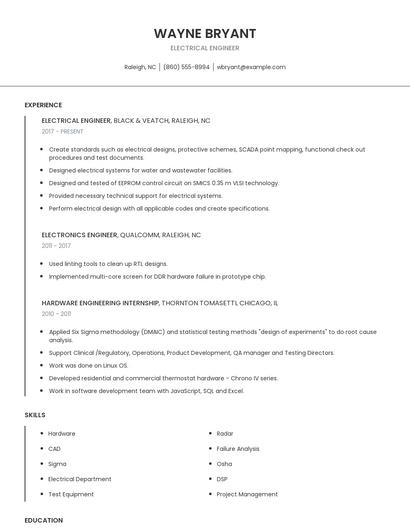 You can use Zippia's AI resume builder to make the resume writing process easier while also making sure that you include key information that hiring managers expect to see on an electrical engineer resume. You'll find resume tips and examples of skills, responsibilities, and summaries, all provided by Zippi, your career sidekick.