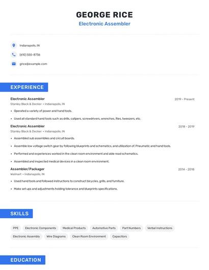 Build a professional electronic assembler resume in minutes. Browse through our resume examples to identify the best way to word your resume. Then choose from 5+ resume templates to create your electronic assembler resume.