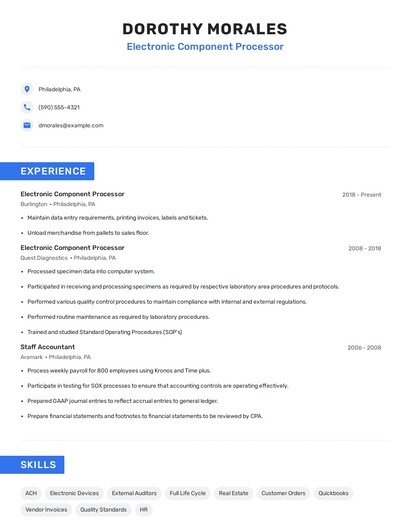 Build a professional electronic component processor resume in minutes. Our AI resume writing assistant will guide you through every step of the process, and you can choose from 10+ resume templates to create your electronic component processor resume.What skills help Electronic Component Processors find jobs?