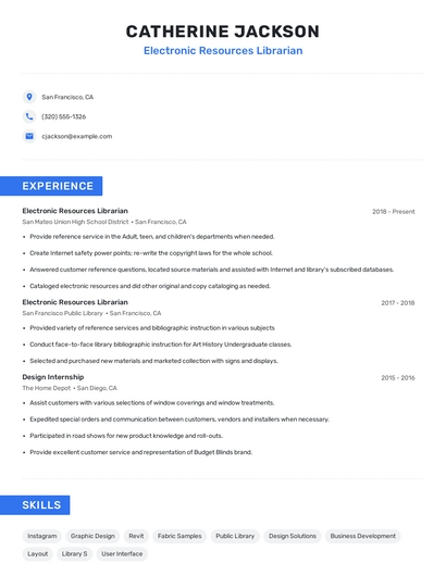 Build a professional electronic resources librarian resume in minutes. Browse through our resume examples to identify the best way to word your resume. Then choose from 5+ resume templates to create your electronic resources librarian resume.