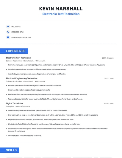 Build a professional electronic test technician resume in minutes. Browse through our resume examples to identify the best way to word your resume. Then choose from 5+ resume templates to create your electronic test technician resume.