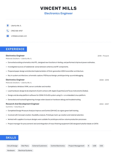 Build a professional electronics engineer resume in minutes. Browse through our resume examples to identify the best way to word your resume. Then choose from 5+ resume templates to create your electronics engineer resume.
