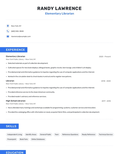 Build a professional elementary librarian resume in minutes. Our AI resume writing assistant will guide you through every step of the process, and you can choose from 10+ resume templates to create your elementary librarian resume.7. K-5