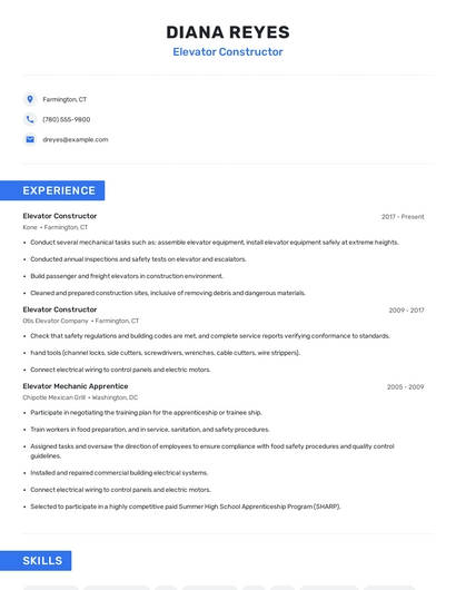 Build a professional elevator constructor resume in minutes. Our AI resume writing assistant will guide you through every step of the process, and you can choose from 10+ resume templates to create your elevator constructor resume.7. Electrical Connections