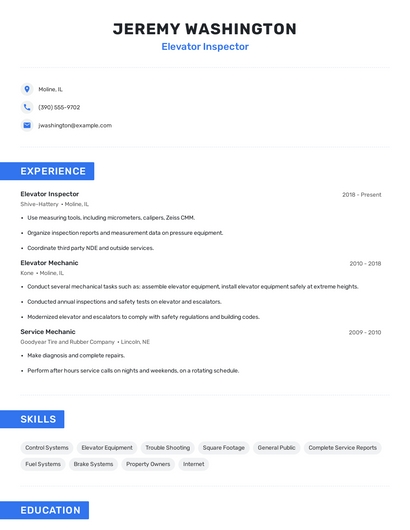 The most important skills for an elevator inspector resume and required skills for an elevator inspector to have include:
