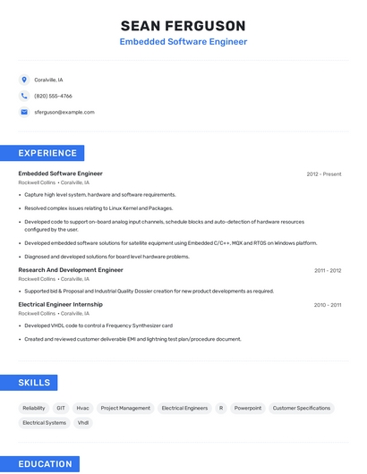 Build a professional embedded software engineer resume in minutes. Browse through our resume examples to identify the best way to word your resume. Then choose from 5+ resume templates to create your embedded software engineer resume.