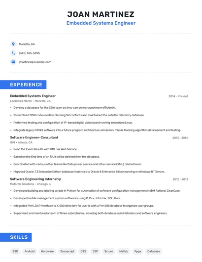 Build a professional embedded systems engineer resume in minutes. Browse through our resume examples to identify the best way to word your resume. Then choose from 5+ resume templates to create your embedded systems engineer resume.
