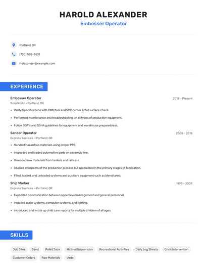 The most important skills for an embosser operator resume and required skills for an embosser operator to have include: