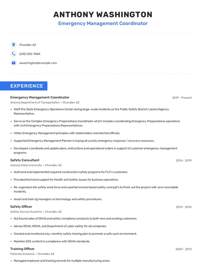 Build a professional emergency management coordinator resume in minutes. Browse through our resume examples to identify the best way to word your resume. Then choose from 5+ resume templates to create your emergency management coordinator resume.