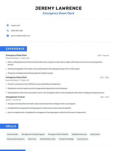 Build a professional emergency room clerk resume in minutes. Browse through our resume examples to identify the best way to word your resume. Then choose from 5+ resume templates to create your emergency room clerk resume.