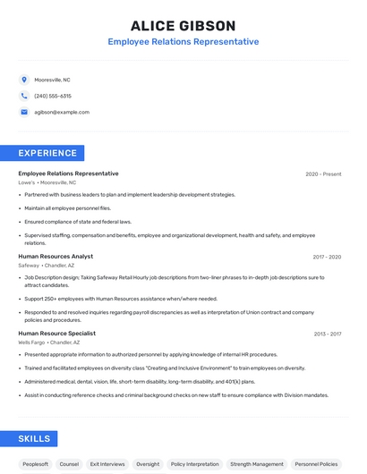 Build a professional employee relations representative resume in minutes. Browse through our resume examples to identify the best way to word your resume. Then choose from 5+ resume templates to create your employee relations representative resume.