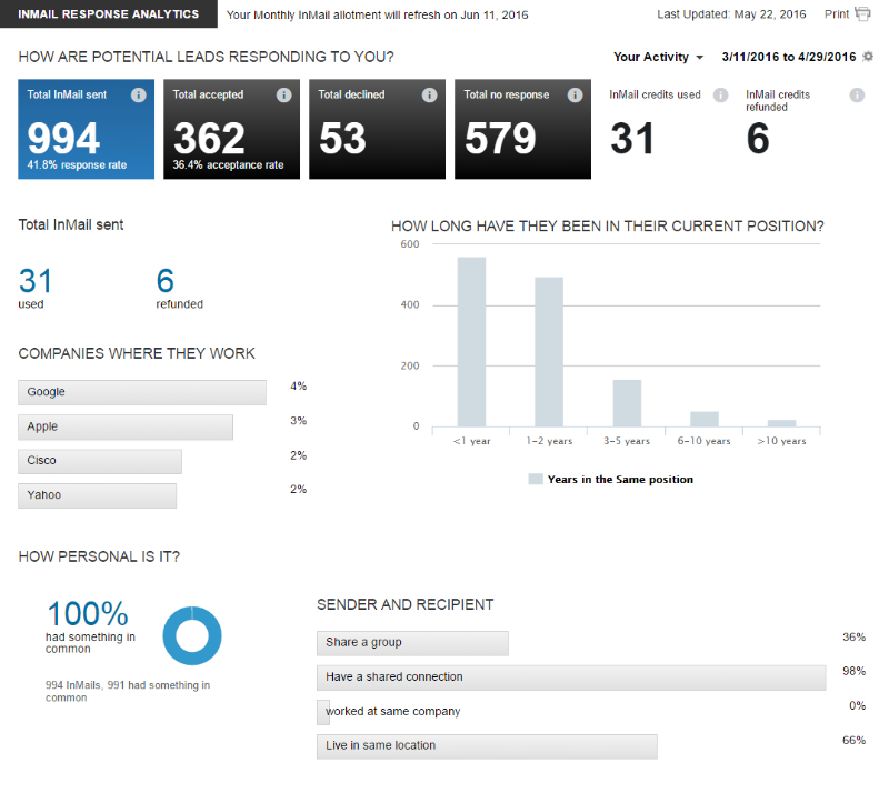 For the past couple of months, I have been recruiting top talent from Google, Apple, Cisco, Yahoo, LinkedIn, and successfully generating interest and applications for placements in early ventures. I achieved 41.3% response rate and 36.1% acceptance rate with 994 InMails in a month and a half which is 22 times the number of InMails for Recruiter Lite, while spending only $119.95/month for my subscription.