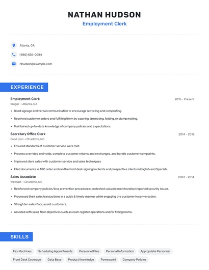 Build a professional employment clerk resume in minutes. Our AI resume writing assistant will guide you through every step of the process, and you can choose from 10+ resume templates to create your employment clerk resume.7. I-9