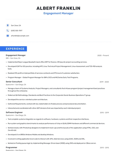 Build a professional engagement manager resume in minutes. Browse through our resume examples to identify the best way to word your resume. Then choose from 5+ resume templates to create your engagement manager resume.