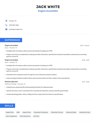 Build a professional engine assembler resume in minutes. Browse through our resume examples to identify the best way to word your resume. Then choose from 5+ resume templates to create your engine assembler resume.