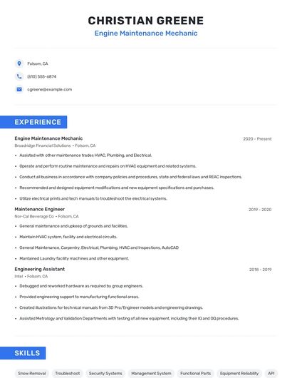 Build a professional engine maintenance mechanic resume in minutes. Browse through our resume examples to identify the best way to word your resume. Then choose from 5+ resume templates to create your engine maintenance mechanic resume.