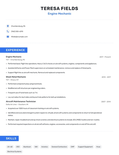 Build a professional engine mechanic resume in minutes. Browse through our resume examples to identify the best way to word your resume. Then choose from 5+ resume templates to create your engine mechanic resume.