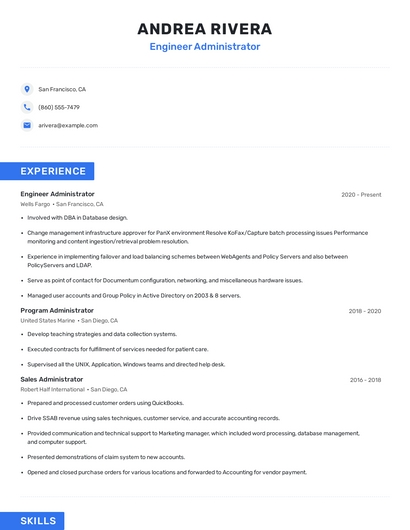 Build a professional engineer administrator resume in minutes. Browse through our resume examples to identify the best way to word your resume. Then choose from 5+ resume templates to create your engineer administrator resume.