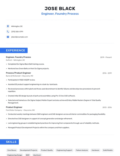 Build a professional engineer, foundry process resume in minutes. Browse through our resume examples to identify the best way to word your resume. Then choose from 5+ resume templates to create your engineer, foundry process resume.