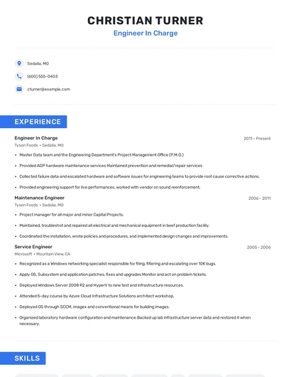 Build a professional engineer in charge resume in minutes. Our AI resume writing assistant will guide you through every step of the process, and you can choose from 10+ resume templates to create your engineer in charge resume.7. RAN