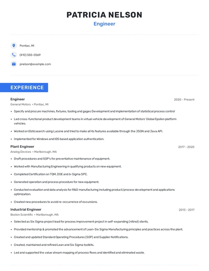 Build a professional engineer resume in minutes. Browse through our resume examples to identify the best way to word your resume. Then choose from 5+ resume templates to create your engineer resume.