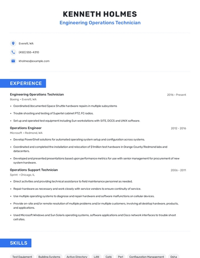Build a professional engineering operations technician resume in minutes. Browse through our resume examples to identify the best way to word your resume. Then choose from 5+ resume templates to create your engineering operations technician resume.