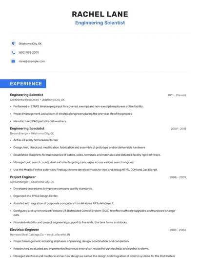 Build a professional engineering scientist resume in minutes. Browse through our resume examples to identify the best way to word your resume. Then choose from 5+ resume templates to create your engineering scientist resume.