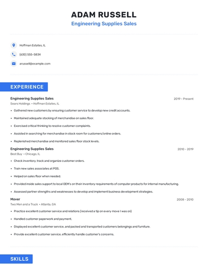 Build a professional engineering supplies sales resume in minutes. Our AI resume writing assistant will guide you through every step of the process, and you can choose from 10+ resume templates to create your engineering supplies sales resume.What skills help Engineering Supplies Sales find jobs?
