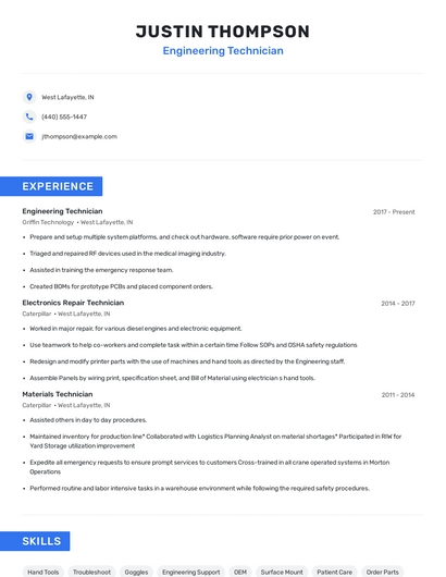 Build a professional engineering technician resume in minutes. Browse through our resume examples to identify the best way to word your resume. Then choose from 5+ resume templates to create your engineering technician resume.