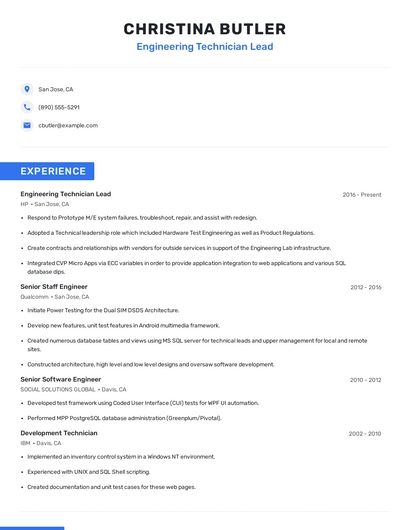 Build a professional engineering technician lead resume in minutes. Browse through our resume examples to identify the best way to word your resume. Then choose from 5+ resume templates to create your engineering technician lead resume.
