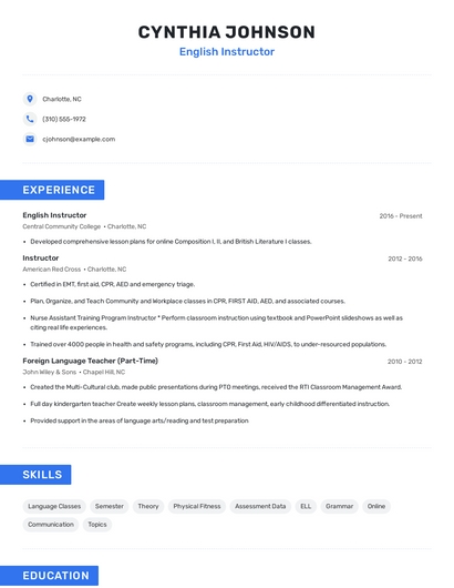 Build a professional english instructor resume in minutes. Browse through our resume examples to identify the best way to word your resume. Then choose from 5+ resume templates to create your english instructor resume.